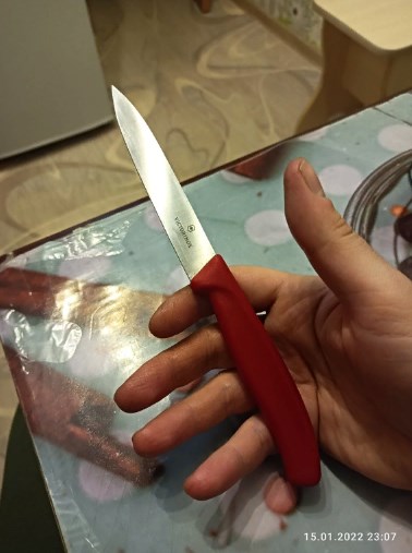 Этот ножик был, так сказать, экспериментальным. Потому что викториноксов у меня еще не было. Теперь хочу еще заказать, потому что качество очень хорошее. В руке не скользит, может разрезать и морковку, и мясо, и хлеб. Универсальный нож.